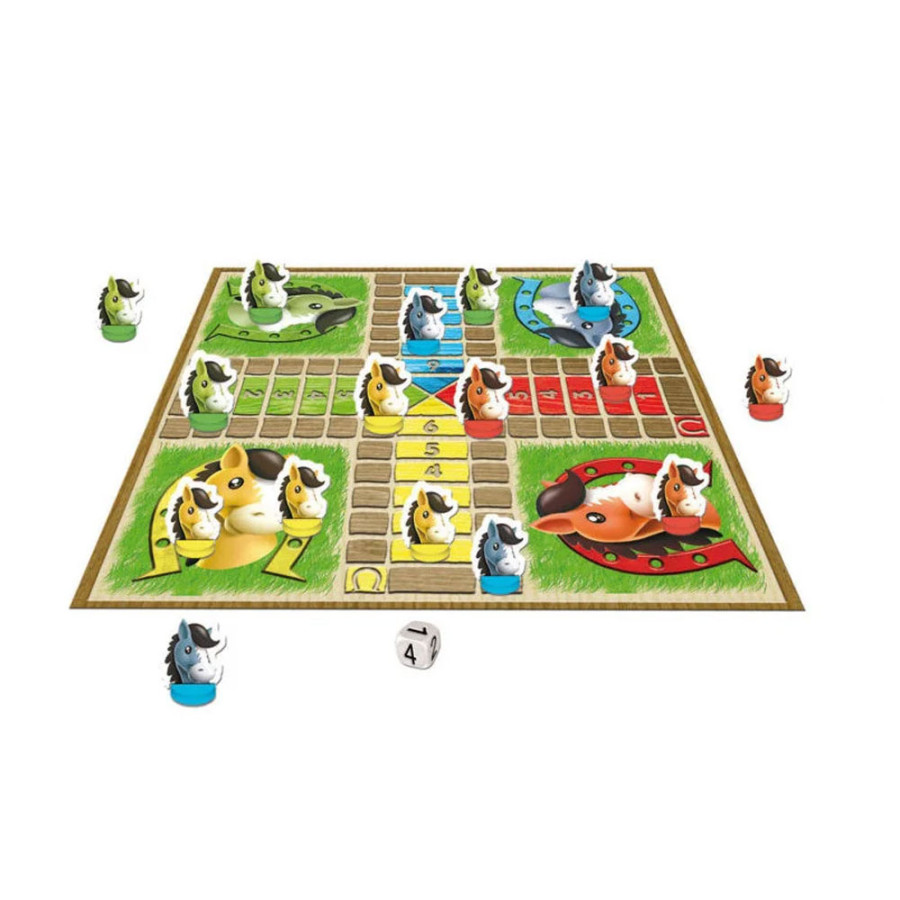 Amuse-toi avec ce jeu de petits chevaux, incontournable pour les petits comme les grands. Déplace tes pions en fonction du chiffre indiqué sur le dé mais attention à ne pas te faire rattraper par tes concurrents ! Le premier arrivé au centre du plateau remporte la partie.