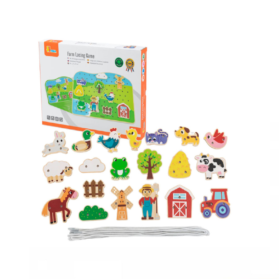 Ce jeu d'enfilage sur le thème de la ferme comprend un plateau de jeu en bois, 20 tuiles à enfiler, 3 fils et 10 modèles illustrant différentes façons d'enfiler les accessoires sur le plateau. Les enfants peuvent également créer une infinité de scènes grâce à leur imagination. Ce jeu contribue au développement de la motricité fine, de la reconnaissance des formes, du sens de l'orientation spatiale et de la coordination œil-main.
