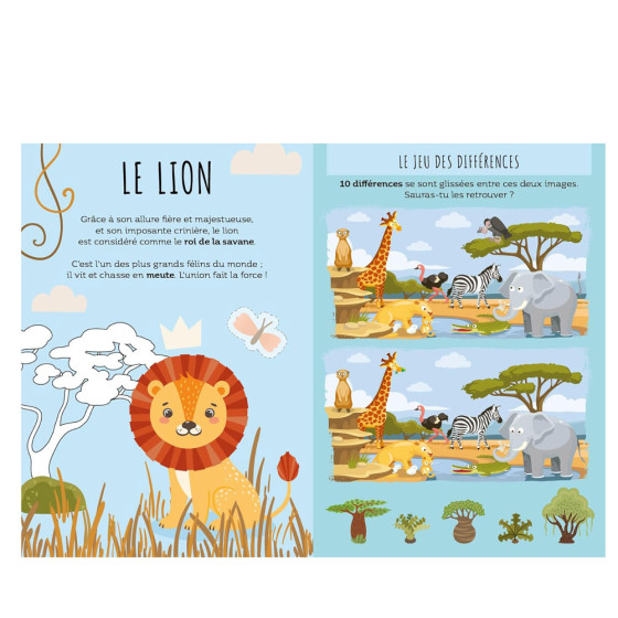 Le célèbre jeu des 7 familles présenté dans une version parfaite pour les petits et dans une variante encore plus amusante ! 44 cartes à jouer illustrées d'animaux de la savane et rassemblées dans un étui pratique, accompagnées d'un livre de 16 pages rempli d'activités et de 40 autocollants.