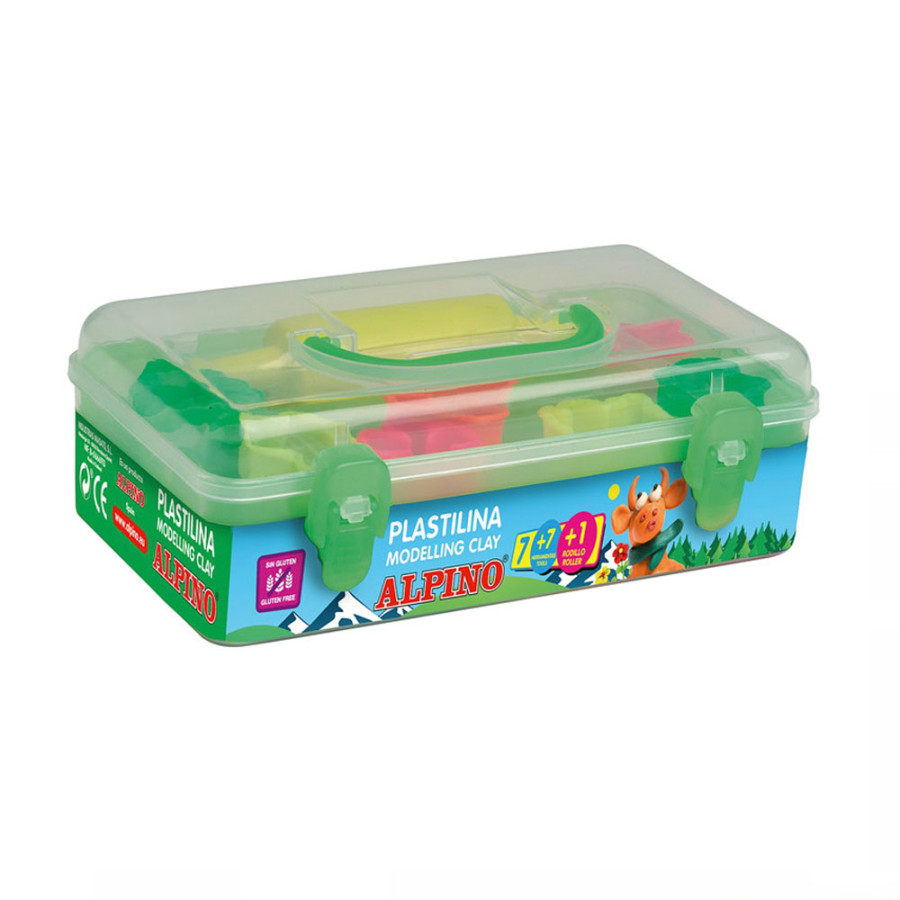 Joli coffret de pâte à modeler Alpino en forme de boîte à outils. Il contient 7 couleurs de pâte à modeler (70 g), 7 outils et 1 rouleau. Idéal pour offrir. Pâte à modeler parfaite pour les enfants.