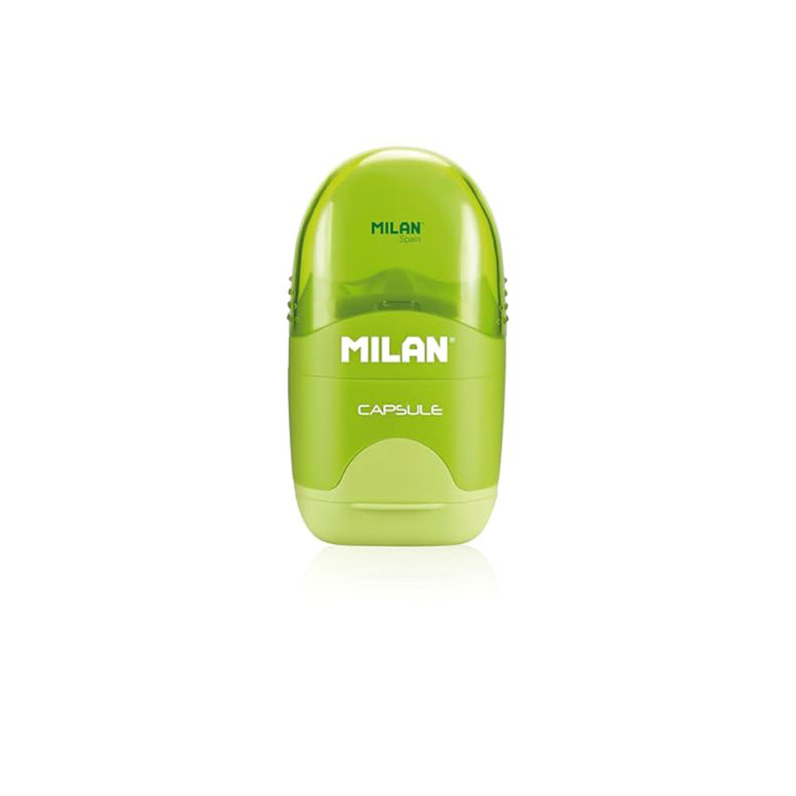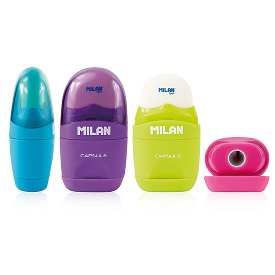 Combinaison d’une gomme à effacer avec un taille-crayons avec réservoir. Design CAPSULE. Le taille-crayons dispose d’une lame en acier affûtée et résistante, idéale pour tout type de crayons.