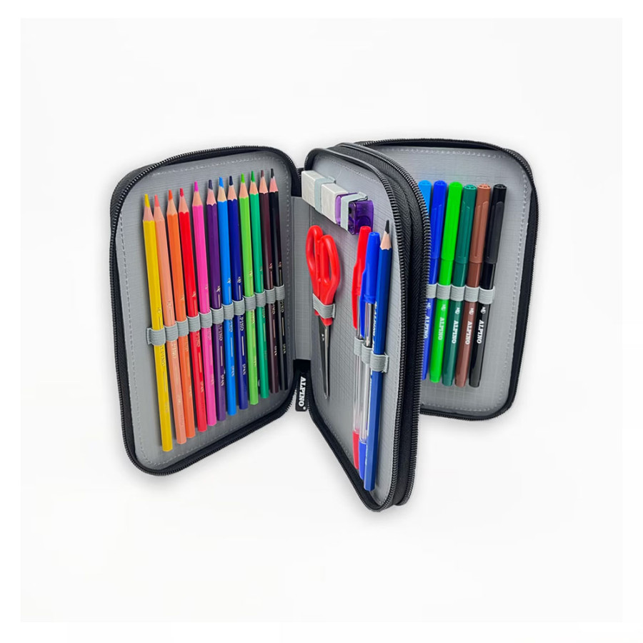 Trousse double noire Alpino, avec double fermeture éclair et renfort intérieur. Idéale pour les crayons et les feutres, étui rembourré.